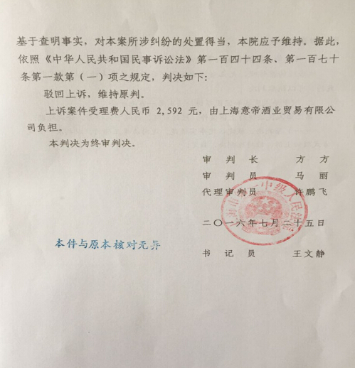 经上海市浦东新区人民法院一审开庭审理,于2016年1月29日作出判决上海意帝酒业贸易有限公司败诉,驳回上海意帝酒业贸易有限公司的全部诉讼请求。上海意帝酒业贸易有限公司不服一审判决结果,再次上诉到上海市第一中级人民法院,经法院开庭二审后,上海市第一中级人民法院作出原审法院认定事实无误的结论。并于2016年7月25日作出判决:驳回上诉,维持原判。本判决为终审判决。