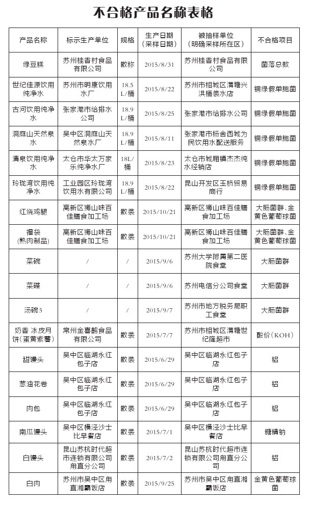 本次食安办针对蔬菜、乳制品、谷物粉类制成品、饮用水及饮料、餐具等品种,展开食品安全日常监督抽检,共抽检2195批次,不合格食品19批次。而针对近期媒体报道“明矾瓜子”事件,市食药局也立即开展调查,分别在生产企业抽检36批次,流通市场抽检22批次,检验铝残留项目,均未发现不合格产品。本次抽检不合格的食品中,有5批次不合格包装饮用水,苏州市明康饮用水厂生产的世纪佳源饮用纯净水、张家港市给排水公司生产的古河饮用纯净水、苏州市吴中区洞庭山天然泉水厂生产的洞庭山天然泉水、太仓市华太万家乐纯净水厂生产的清泉饮用纯净水、苏州工业园区玲珑湾饮用水有限公司生产的玲珑湾饮用纯净水,均检出铜绿假单胞菌;吴中区临湖永红包子店的甜馒头、葱油花卷、肉包等,分别检出铝超标。还有不合格面制品5批次,主要是铝超标和检出糖精钠;个别卤菜中金黄色葡萄球菌超标;个别快餐中大肠菌群不符合国家有关标准等等。