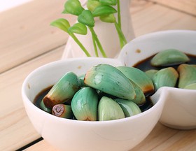 泡腊八蒜是一道主要流行于北方,尤其是华北地区的传统小吃,是腊八节节日食俗。在阴历腊月初八的这天来泡制蒜。其实材料非常简单,就是醋和大蒜瓣儿。做法也是极其简单,将剥了皮的蒜瓣儿放到一个可以密封的罐子,瓶子之类的容器里面,然后倒入醋,封上口放到一个冷的地方。慢慢地,泡在醋中的蒜就会变绿,最后会变得通体碧绿的,如同翡翠碧玉。中国北方一到腊月初八,过年的气氛一天赛过一天,华北大部分地区在腊月初八这天有用醋泡蒜的习俗,叫腊八蒜。[4]